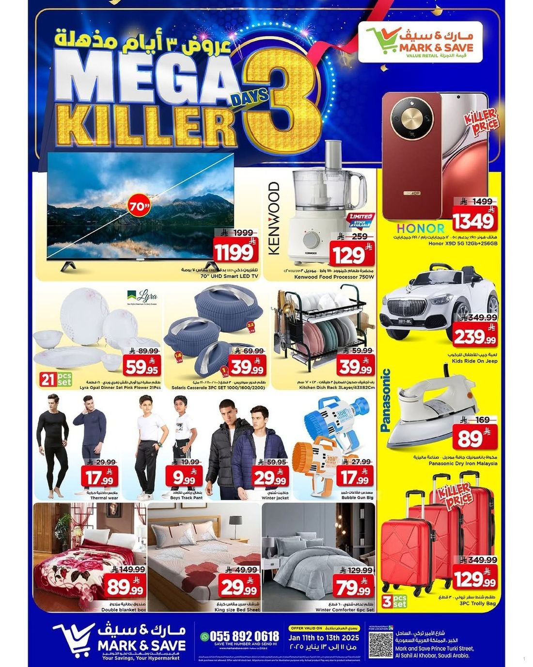 تخفيضات الالكترونيات ولوازم المنزل من مارك اند سيف في الخبر عروضاً جذابة على تشكيلة واسعة من الاجهزة المنزلية والجوالات والملابس العصرية والإكسسوارات الراقية للرجال والنساء والأطفال. تشمل العروض أيضاً منتجات المنزل والعناية الشخصية بتصاميم أنيقة وجودة عالية تلائم جميع الأذواق. يقع الفرع على طريق الأمير تركي، حي الساحل، مما يجعله وجهة مثالية للتسوق اليومي.