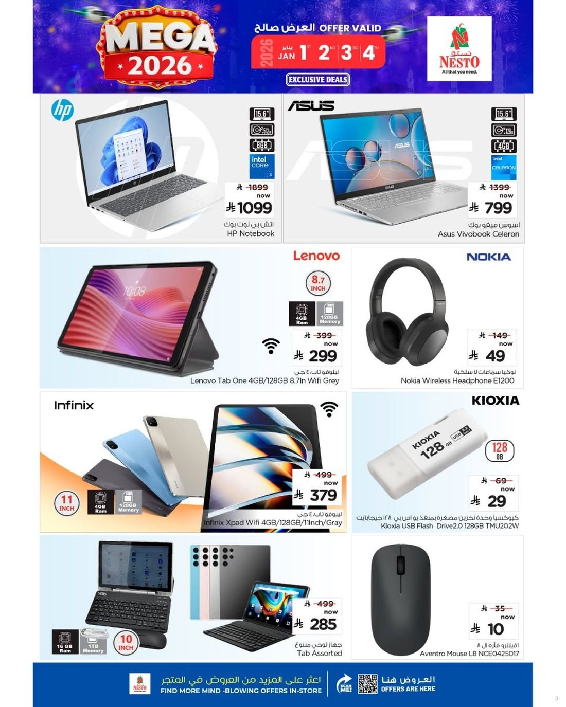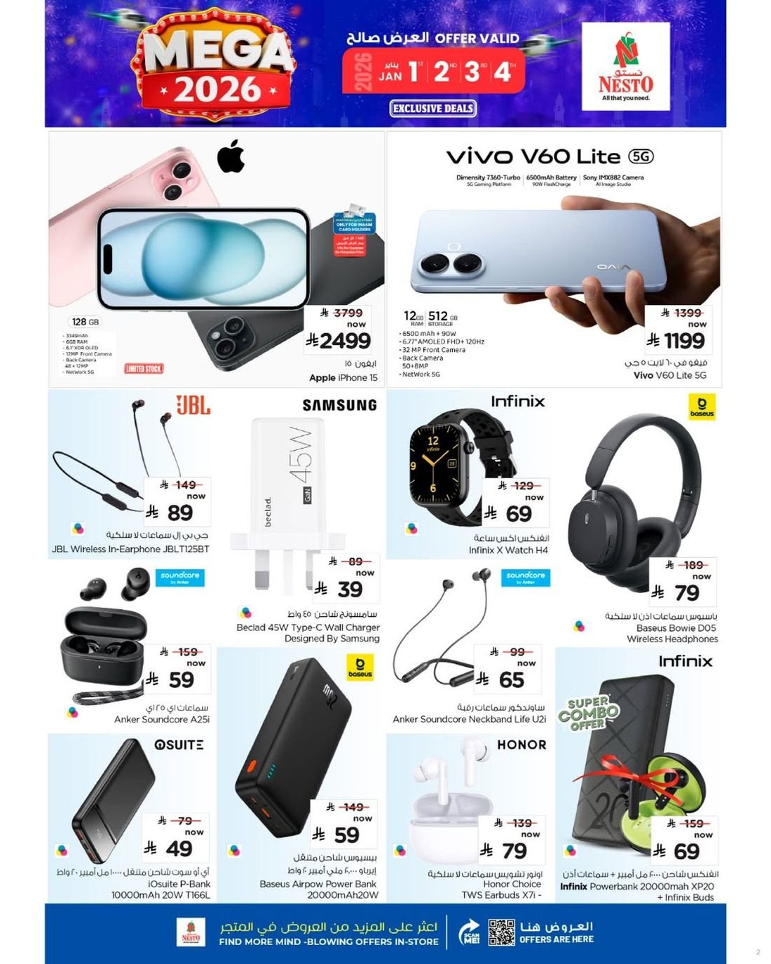 عروض قوية من نستو هايبر ماركت في السعودية على مجموعة مميزة من العروض على الإلكترونيات المتنوعة تشمل أحدث الهواتف الذكية والأجهزة اللوحية بشاشات عالية الدقة. كما تتضمن العروض أجهزة التلفاز بتقنيات حديثة تمنح تجربة مشاهدة غامرة وجودة صوت فائقة. وتشمل التخفيضات أجهزة الكمبيوتر المحمولة والإكسسوارات الذكية المناسبة للدراسة والعمل والترفيه.