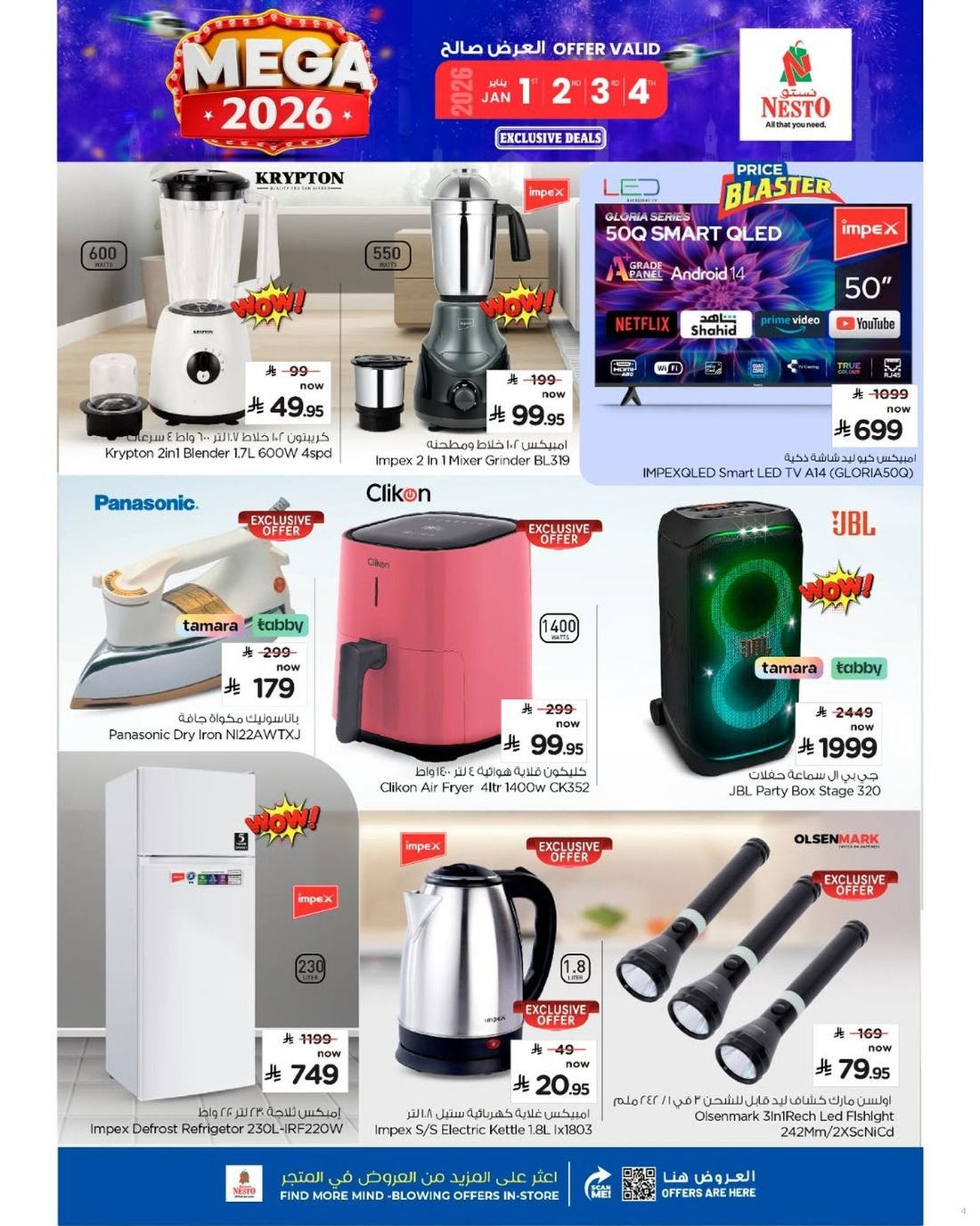 وتوفر نستو أيضاً خصومات على الأجهزة المنزلية مثل الميكروويف والخلاطات وأدوات المطبخ الكهربائية بتصاميم عصرية. وتتميز العروض بأنها محدودة المدة وتجمع بين الجودة العالية والتنويع لتلبية احتياجات جميع أفراد الأسرة.